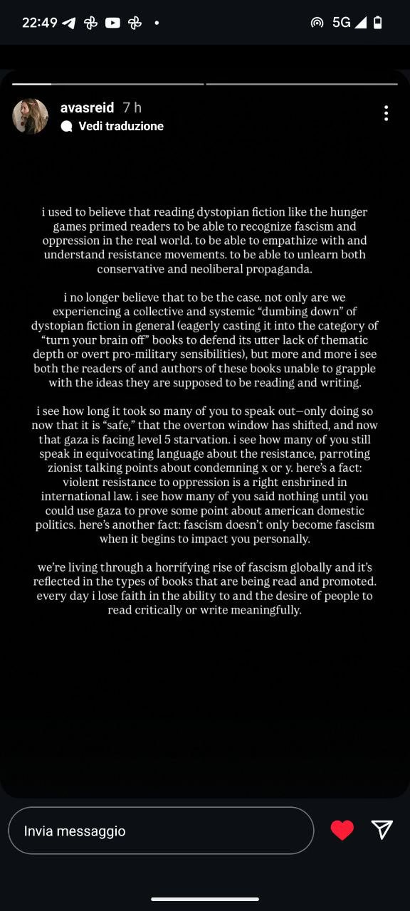 Trovo imperdonabile che un genere politico come la distopia sia stato svuotato del proprio intento, le ambientazioni allontanate nello spazio (come a dire che no, da noi non funziona certo così signora mia!) o nel tempo, ridotte a un teatrino su cui mettere in scena – di nuovo – il crollo del mondo borghese. È imperdonabile la vacuità delle posizioni, il disimpegno che non resta nelle pagine, ma si traduce in silenzio nei canali social, mentre la realtà prende a testate le porte.
